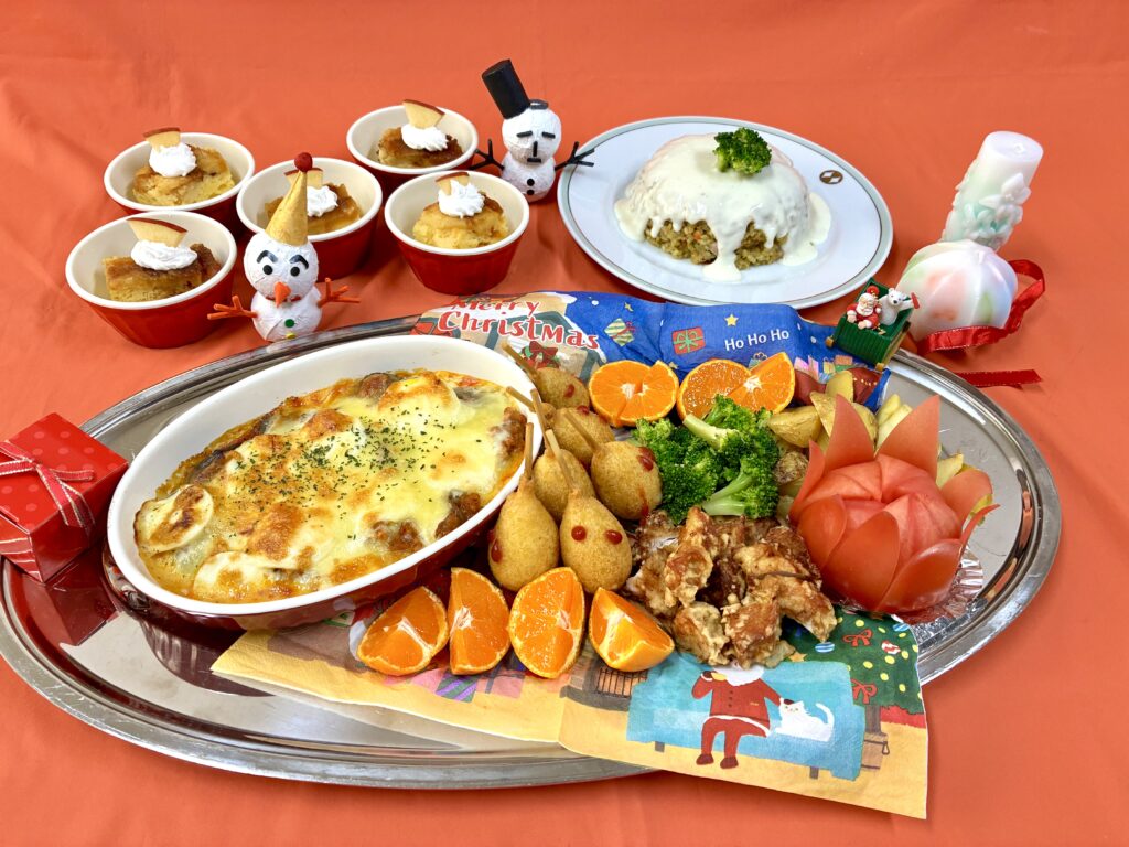 グラタン、ミニアメリカンドッグ、アップルケーキ、フライドチキン、ポテト、カレーピラフのホワイトソースがけ等